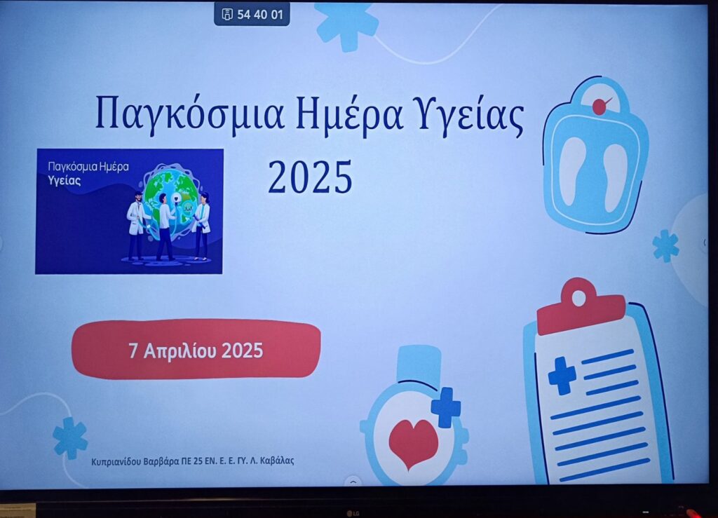 Τη Δευτέρα 7 Απριλίου 2025, με αφορμή την Παγκόσμια Ημέρα Υγείας, στο σχολείο μας, το ΕΝ.Ε.Ε.ΓΥ.Λ. Καβάλας, πραγματοποιήθηκε δράση στο πλαίσιο του Προγράμματος Σχολικών Δραστηριοτήτων με τίτλο «Στο βασίλειο της υγιεινής».